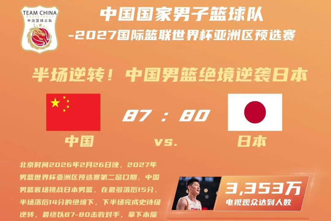 中国篮球之队发表文章透露,中国男篮对阵日本的比赛直播收视率0.81%,位列2026年中央台五套篮球节目收视率第一位;比赛电视观众达到人数3353万人,观赛总分钟数13.8亿分钟。