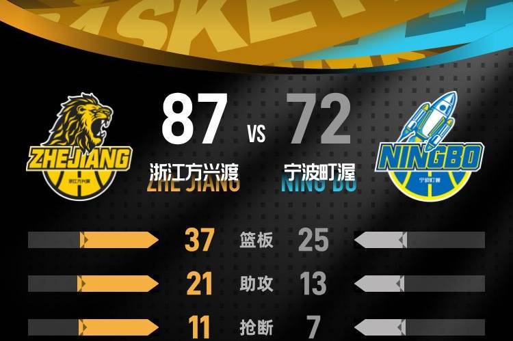 第四节开始后,胡金秋两次内线进攻拿下4分,领先优势扩大到16分,戴昊抛投得分,俞长栋接到助攻命中三分缩小分差,塔克马上命中三分回应。赵嘉仁连续两记三分命中,分差扩大到20分,塔克连续内线得分,分差一度拉开到23分。宁波换下主力球员后依旧积极追分,赵岩昊命中三分稳住局势,后续宁波连续得到8分缩小分差,最终浙江主场收下这场胜利,比分定格为87-72。